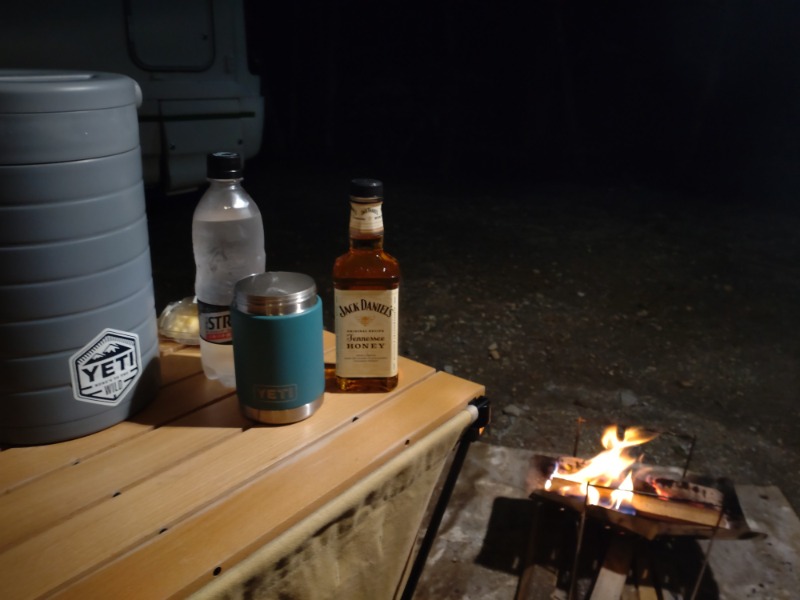 買出しで見付けたジャックダニエルハニーで少し甘めのハイボールと焚き火でゆったりとした時間存分に満喫♪