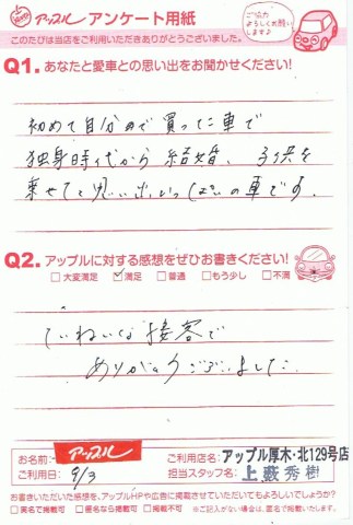 お車のご相談・ 査定だけでもOK! カンタン 入力 30秒 アップルがブランド買取始めました! お電話でも受付中! 受付時間10:00 ~ 19:00 046-246-2828 お車のご相談・ 査定だけでもOK! カンタン 入力 30秒 アップルがブランド買取始めました! お電話でも受付中! 受付時間10:00 ~ 19:00 046-246-2828 アップルがブランド買取始めました! お電話でも受付中! 受付時間10:00 ~ 19:00 046-246-2828 店舗情報 在庫車 スタッフ紹介 ブログ お客様の声 キャンペーン 無料査定 click お客様の声 ご記入日: 2013/09/03 I様 ていねいな接客でありがとうございました。 前へ 次へ お客様の声一覧を見る