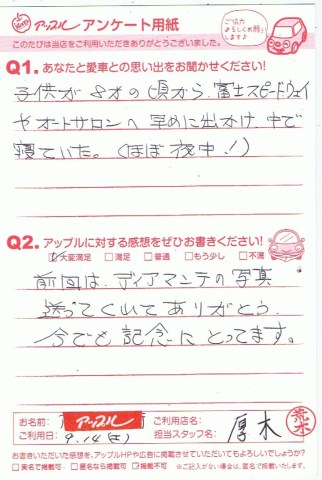 お車のご相談・ 査定だけでもOK! カンタン 入力 30秒 アップルがブランド買取始めました! お電話でも受付中! 受付時間10:00 ~ 19:00 046-246-2828 お車のご相談・ 査定だけでもOK! カンタン 入力 30秒 アップルがブランド買取始めました! お電話でも受付中! 受付時間10:00 ~ 19:00 046-246-2828 アップルがブランド買取始めました! お電話でも受付中! 受付時間10:00 ~ 19:00 046-246-2828 店舗情報 在庫車 スタッフ紹介 ブログ お客様の声 キャンペーン 無料査定 click お客様の声 ご記入日: 2013/09/14 T様 前回は、ディアマンテの写真送ってくれてありがとう。今でも記念にとってます。 前へ 次へ お客様の声一覧を見る