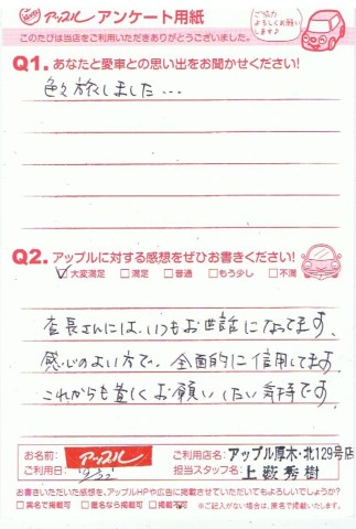 お車のご相談・ 査定だけでもOK! カンタン 入力 30秒 アップルがブランド買取始めました! お電話でも受付中! 受付時間10:00 ~ 19:00 046-246-2828 お車のご相談・ 査定だけでもOK! カンタン 入力 30秒 アップルがブランド買取始めました! お電話でも受付中! 受付時間10:00 ~ 19:00 046-246-2828 アップルがブランド買取始めました! お電話でも受付中! 受付時間10:00 ~ 19:00 046-246-2828 店舗情報 在庫車 スタッフ紹介 ブログ お客様の声 キャンペーン 無料査定 click お客様の声 ご記入日: 2013/09/22 K様 店長さんには、いつもお世話になってます。感じのよい方で、全面的に信用しています。これからも宜しくお願いしたい気持ちです。 前へ 次へ お客様の声一覧を見る
