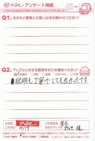 お車のご相談・ 査定だけでもOK! カンタン 入力 30秒 アップルがブランド買取始めました! お電話でも受付中! 受付時間10:00 ~ 19:00 046-246-2828 お車のご相談・ 査定だけでもOK! カンタン 入力 30秒 アップルがブランド買取始めました! お電話でも受付中! 受付時間10:00 ~ 19:00 046-246-2828 アップルがブランド買取始めました! お電話でも受付中! 受付時間10:00 ~ 19:00 046-246-2828 店舗情報 在庫車 スタッフ紹介 ブログ お客様の声 キャンペーン 無料査定 click お客様の声 ご記入日: 2013/10/19 M様 説明も丁寧でとても良かったです。 前へ 次へ お客様の声一覧を見る