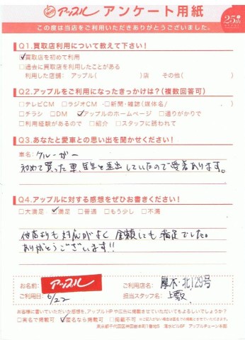 お車のご相談・ 査定だけでもOK! カンタン 入力 30秒 アップルがブランド買取始めました! お電話でも受付中! 受付時間10:00 ~ 19:00 046-246-2828 お車のご相談・ 査定だけでもOK! カンタン 入力 30秒 アップルがブランド買取始めました! お電話でも受付中! 受付時間10:00 ~ 19:00 046-246-2828 アップルがブランド買取始めました! お電話でも受付中! 受付時間10:00 ~ 19:00 046-246-2828 店舗情報 在庫車 スタッフ紹介 ブログ お客様の声 キャンペーン 無料査定 click お客様の声 ご記入日: 2014/06/22 M様 他店よりも対応がよく金額も満足でした。ありがとうございます!! 前へ 次へ お客様の声一覧を見る