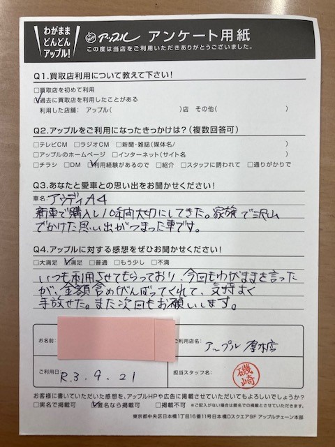 お車のご相談・ 査定だけでもOK! カンタン 入力 30秒 アップルがブランド買取始めました! お電話でも受付中! 受付時間10:00 ~ 19:00 046-246-2828 お車のご相談・ 査定だけでもOK! カンタン 入力 30秒 アップルがブランド買取始めました! お電話でも受付中! 受付時間10:00 ~ 19:00 046-246-2828 アップルがブランド買取始めました! お電話でも受付中! 受付時間10:00 ~ 19:00 046-246-2828 店舗情報 在庫車 スタッフ紹介 ブログ お客様の声 キャンペーン 無料査定 click お客様の声 ご記入日: 2021/09/21 神奈川県厚木市 S様 車名:アウディ A4 いつも利用させてもらっており、今回もわがままを言ったが、金額含め頑張ってくれて、気持ちよく手放せた。また次回もお願いします。 前へ 次へ お客様の声一覧を見る