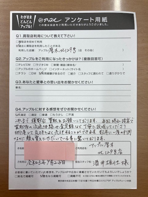 これまで複数台買取をお願いしております。毎回明るい接客で買取後の流通経路や査定額など丁寧に説明してくださり