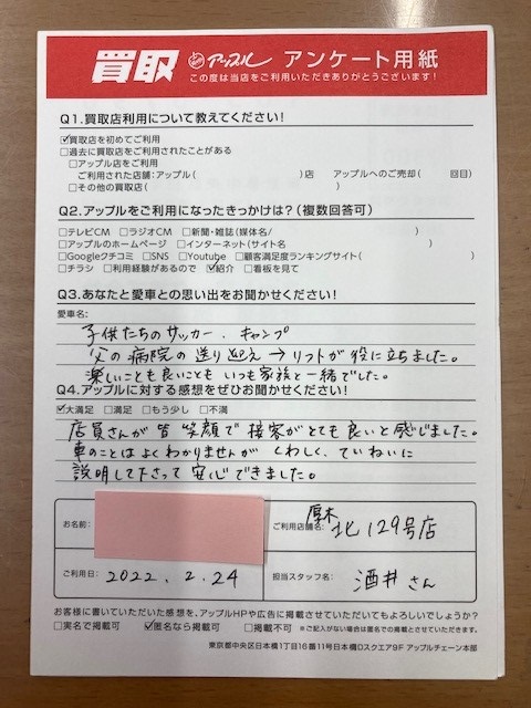 お車のご相談・ 査定だけでもOK! カンタン 入力 30秒 アップルがブランド買取始めました! お電話でも受付中! 受付時間10:00 ~ 19:00 046-246-2828 お車のご相談・ 査定だけでもOK! カンタン 入力 30秒 アップルがブランド買取始めました! お電話でも受付中! 受付時間10:00 ~ 19:00 046-246-2828 アップルがブランド買取始めました! お電話でも受付中! 受付時間10:00 ~ 19:00 046-246-2828 店舗情報 在庫車 スタッフ紹介 ブログ お客様の声 キャンペーン 無料査定 click お客様の声 ご記入日: 2022/02/24 神奈川県厚木市 T様 車名:トヨタ ノア 店員さんが皆、笑顔で接客がとても良いと感じました。車のことはよくわかりませんが、詳しく、丁寧に説明してくださって安心できました。 前へ 次へ お客様の声一覧を見る
