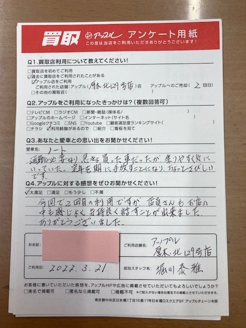 お車のご相談・ 査定だけでもOK! カンタン 入力 30秒 アップルがブランド買取始めました! お電話でも受付中! 受付時間10:00 ~ 19:00 046-246-2828 お車のご相談・ 査定だけでもOK! カンタン 入力 30秒 アップルがブランド買取始めました! お電話でも受付中! 受付時間10:00 ~ 19:00 046-246-2828 アップルがブランド買取始めました! お電話でも受付中! 受付時間10:00 ~ 19:00 046-246-2828 店舗情報 在庫車 スタッフ紹介 ブログ お客様の声 キャンペーン 無料査定 click お客様の声 ご記入日: 2022/03/21 神奈川県厚木市 T様 車名:日産 ノート 今回で2回目の利用ですが、店員さんもお店の中も感じよく気持ちよく話すことが出来ました。ありがとうございました。 前へ 次へ お客様の声一覧を見る