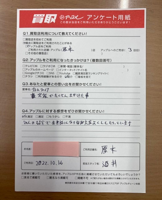 お車のご相談・ 査定だけでもOK! カンタン 入力 30秒 アップルがブランド買取始めました! お電話でも受付中! 受付時間10:00 ~ 19:00 046-246-2828 お車のご相談・ 査定だけでもOK! カンタン 入力 30秒 アップルがブランド買取始めました! お電話でも受付中! 受付時間10:00 ~ 19:00 046-246-2828 アップルがブランド買取始めました! お電話でも受付中! 受付時間10:00 ~ 19:00 046-246-2828 店舗情報 在庫車 スタッフ紹介 ブログ お客様の声 キャンペーン 無料査定 click お客様の声 ご記入日: 2022/10/16 厚木市 I様 車名:トヨタ ヴェルファイア(H27年1月~のHYBRID含む) 知人の紹介でお世話になり毎回大変よくしてもらっています。 前へ 次へ お客様の声一覧を見る