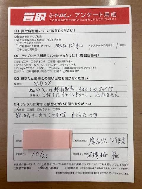 お車のご相談・ 査定だけでもOK! カンタン 入力 30秒 アップルがブランド買取始めました! お電話でも受付中! 受付時間10:00 ~ 19:00 046-246-2828 お車のご相談・ 査定だけでもOK! カンタン 入力 30秒 アップルがブランド買取始めました! お電話でも受付中! 受付時間10:00 ~ 19:00 046-246-2828 アップルがブランド買取始めました! お電話でも受付中! 受付時間10:00 ~ 19:00 046-246-2828 店舗情報 在庫車 スタッフ紹介 ブログ お客様の声 キャンペーン 無料査定 click お客様の声 ご記入日: 2022/10/23 厚木市 Y様 車名:ホンダ N-BOX 説明もわかりやすくて良かったです。 前へ 次へ お客様の声一覧を見る