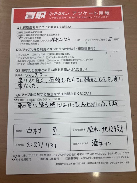 お車のご相談・ 査定だけでもOK! カンタン 入力 30秒 アップルがブランド買取始めました! お電話でも受付中! 受付時間10:00 ~ 19:00 046-246-2828 お車のご相談・ 査定だけでもOK! カンタン 入力 30秒 アップルがブランド買取始めました! お電話でも受付中! 受付時間10:00 ~ 19:00 046-246-2828 アップルがブランド買取始めました! お電話でも受付中! 受付時間10:00 ~ 19:00 046-246-2828 店舗情報 在庫車 スタッフ紹介 ブログ お客様の声 キャンペーン 無料査定 click お客様の声 ご記入日: 2023/01/31 海老名市 中村様 車名:日産 エクストレイル 走りが良く荷物もたくさん積めてとても良い車だった。車の買い替え時にはいつもお世話になってます。 前へ 次へ お客様の声一覧を見る