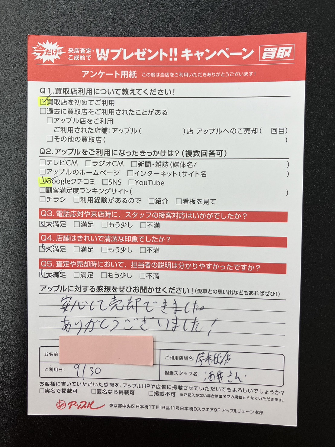 お車のご相談・ 査定だけでもOK! カンタン 入力 30秒 アップルがブランド買取始めました! お電話でも受付中! 受付時間10:00 ~ 19:00 046-246-2828 お車のご相談・ 査定だけでもOK! カンタン 入力 30秒 アップルがブランド買取始めました! お電話でも受付中! 受付時間10:00 ~ 19:00 046-246-2828 アップルがブランド買取始めました! お電話でも受付中! 受付時間10:00 ~ 19:00 046-246-2828 店舗情報 在庫車 スタッフ紹介 ブログ お客様の声 キャンペーン 無料査定 click お客様の声 ご記入日: 2023/09/30 東京都日野市 Y様 車名:トヨタ ヴィッツ 安心して売却できました。ありがとうございました! 前へ 次へ お客様の声一覧を見る