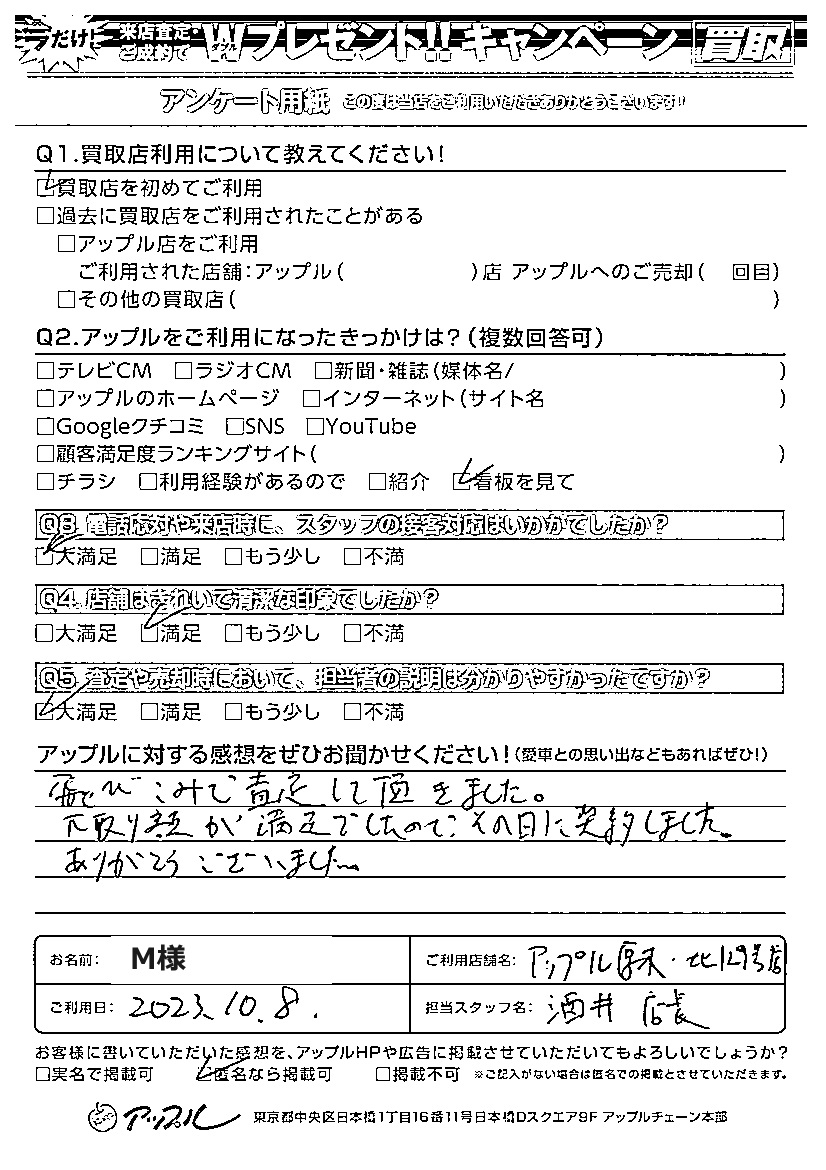 お車のご相談・ 査定だけでもOK! カンタン 入力 30秒 アップルがブランド買取始めました! お電話でも受付中! 受付時間10:00 ~ 19:00 046-246-2828 お車のご相談・ 査定だけでもOK! カンタン 入力 30秒 アップルがブランド買取始めました! お電話でも受付中! 受付時間10:00 ~ 19:00 046-246-2828 アップルがブランド買取始めました! お電話でも受付中! 受付時間10:00 ~ 19:00 046-246-2828 店舗情報 在庫車 スタッフ紹介 ブログ お客様の声 キャンペーン 無料査定 click お客様の声 ご記入日: 2023/12/21 M様 ご利用日:2023年10月8日 担当:酒井アップルに対する感想をぜひお聞かせください!大満足跳びこみで査定して頂きました。下取り額が満足でしたので、その日に契約しました。 前へ 次へ お客様の声一覧を見る