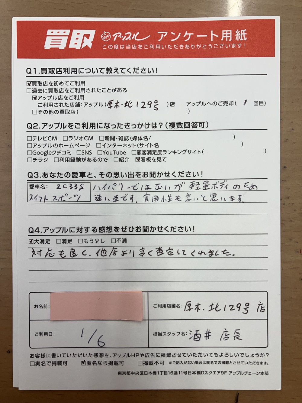 お車のご相談・ 査定だけでもOK! カンタン 入力 30秒 アップルがブランド買取始めました! お電話でも受付中! 受付時間10:00 ~ 19:00 046-246-2828 お車のご相談・ 査定だけでもOK! カンタン 入力 30秒 アップルがブランド買取始めました! お電話でも受付中! 受付時間10:00 ~ 19:00 046-246-2828 アップルがブランド買取始めました! お電話でも受付中! 受付時間10:00 ~ 19:00 046-246-2828 店舗情報 在庫車 スタッフ紹介 ブログ お客様の声 キャンペーン 無料査定 click お客様の声 ご記入日: 2024/01/06 神奈川県厚木市 Y様 車名:スズキ スイフト 対応も良く他店より高く査定してくれました。 前へ 次へ お客様の声一覧を見る