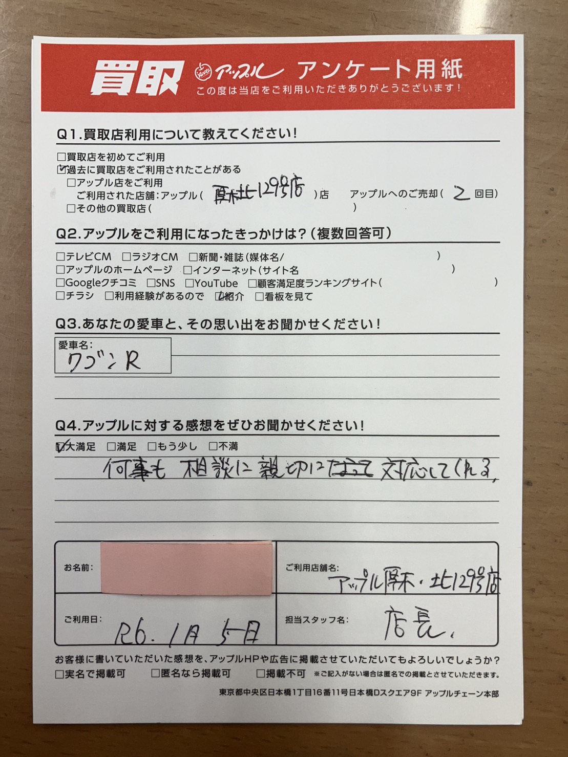 お車のご相談・ 査定だけでもOK! カンタン 入力 30秒 アップルがブランド買取始めました! お電話でも受付中! 受付時間10:00 ~ 19:00 046-246-2828 お車のご相談・ 査定だけでもOK! カンタン 入力 30秒 アップルがブランド買取始めました! お電話でも受付中! 受付時間10:00 ~ 19:00 046-246-2828 アップルがブランド買取始めました! お電話でも受付中! 受付時間10:00 ~ 19:00 046-246-2828 店舗情報 在庫車 スタッフ紹介 ブログ お客様の声 キャンペーン 無料査定 click お客様の声 ご記入日: 2024/01/05 神奈川県厚木市 I様 車名:スズキ ワゴンR 何事も相談に親切に対応してくれる。 前へ 次へ お客様の声一覧を見る