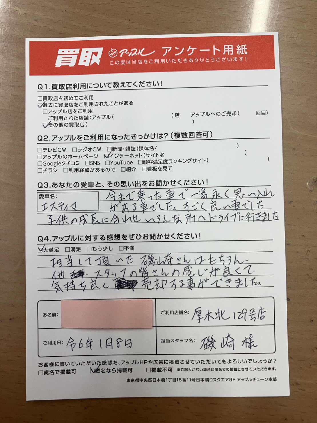 お車のご相談・ 査定だけでもOK! カンタン 入力 30秒 アップルがブランド買取始めました! お電話でも受付中! 受付時間10:00 ~ 19:00 046-246-2828 お車のご相談・ 査定だけでもOK! カンタン 入力 30秒 アップルがブランド買取始めました! お電話でも受付中! 受付時間10:00 ~ 19:00 046-246-2828 アップルがブランド買取始めました! お電話でも受付中! 受付時間10:00 ~ 19:00 046-246-2828 店舗情報 在庫車 スタッフ紹介 ブログ お客様の声 キャンペーン 無料査定 click お客様の声 ご記入日: 2024/01/08 神奈川県厚木市 K様 車名:トヨタ エスティマ 担当して頂いた磯崎さんはもちろん、他スタッフの皆さんの感じが良くて気持ち良く売却することが出来ました。 前へ 次へ お客様の声一覧を見る