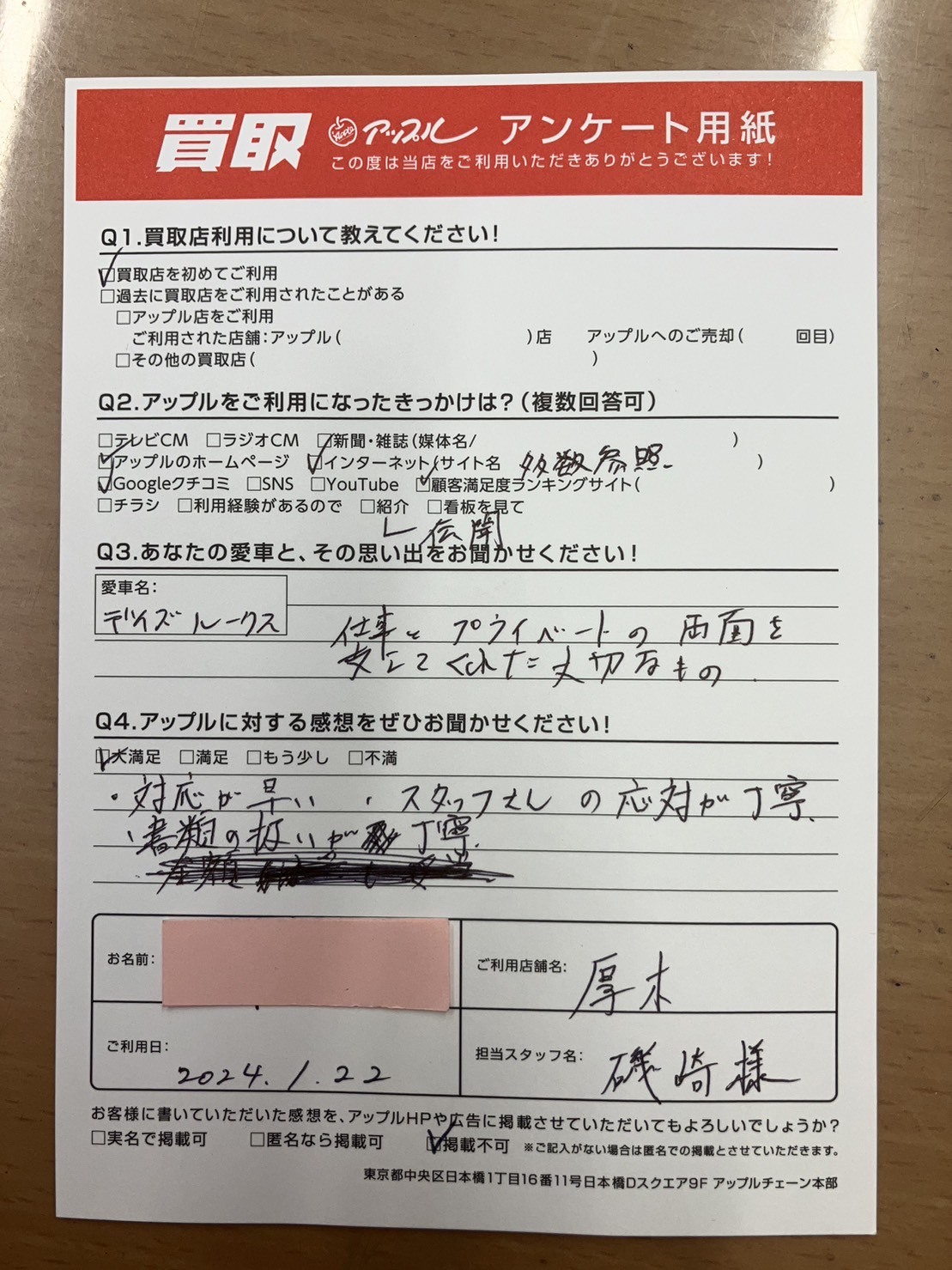 お車のご相談・ 査定だけでもOK! カンタン 入力 30秒 アップルがブランド買取始めました! お電話でも受付中! 受付時間10:00 ~ 19:00 046-246-2828 お車のご相談・ 査定だけでもOK! カンタン 入力 30秒 アップルがブランド買取始めました! お電話でも受付中! 受付時間10:00 ~ 19:00 046-246-2828 アップルがブランド買取始めました! お電話でも受付中! 受付時間10:00 ~ 19:00 046-246-2828 店舗情報 在庫車 スタッフ紹介 ブログ お客様の声 キャンペーン 無料査定 click お客様の声 ご記入日: 2024/01/22 神奈川県座間市 S様 車名:日産 デイズルークス 対応が早い、スタッフさんの対応が丁寧書類の扱いが丁寧 前へ 次へ お客様の声一覧を見る