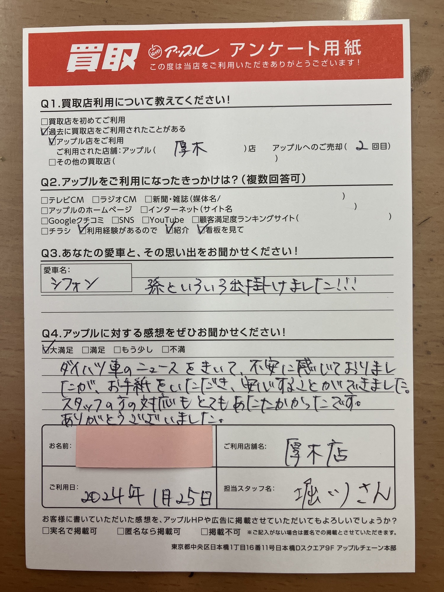 お車のご相談・ 査定だけでもOK! カンタン 入力 30秒 アップルがブランド買取始めました! お電話でも受付中! 受付時間10:00 ~ 19:00 046-246-2828 お車のご相談・ 査定だけでもOK! カンタン 入力 30秒 アップルがブランド買取始めました! お電話でも受付中! 受付時間10:00 ~ 19:00 046-246-2828 アップルがブランド買取始めました! お電話でも受付中! 受付時間10:00 ~ 19:00 046-246-2828 店舗情報 在庫車 スタッフ紹介 ブログ お客様の声 キャンペーン 無料査定 click お客様の声 ご記入日: 2024/01/25 神奈川県海老名市 S様 車名:スバル シフォン ダイハツ車のニュースをきいて、不安に感じておりましたが、お手紙をいただき、安心することができました。スタッフの方の対応もとてもあたたかかったです。ありがとうございました。 前へ 次へ お客様の声一覧を見る