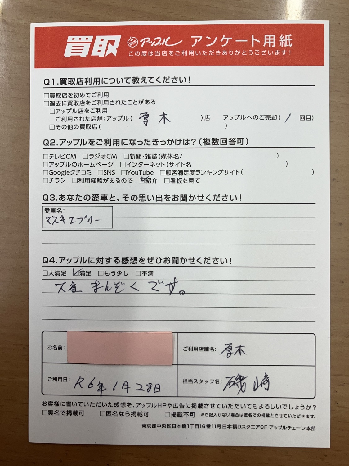 お車のご相談・ 査定だけでもOK! カンタン 入力 30秒 アップルがブランド買取始めました! お電話でも受付中! 受付時間10:00 ~ 19:00 046-246-2828 お車のご相談・ 査定だけでもOK! カンタン 入力 30秒 アップルがブランド買取始めました! お電話でも受付中! 受付時間10:00 ~ 19:00 046-246-2828 アップルがブランド買取始めました! お電話でも受付中! 受付時間10:00 ~ 19:00 046-246-2828 店舗情報 在庫車 スタッフ紹介 ブログ お客様の声 キャンペーン 無料査定 click お客様の声 ご記入日: 2024/01/28 神奈川県厚木市 S様 車名:スズキ エブリイ 大変満足です。 前へ 次へ お客様の声一覧を見る
