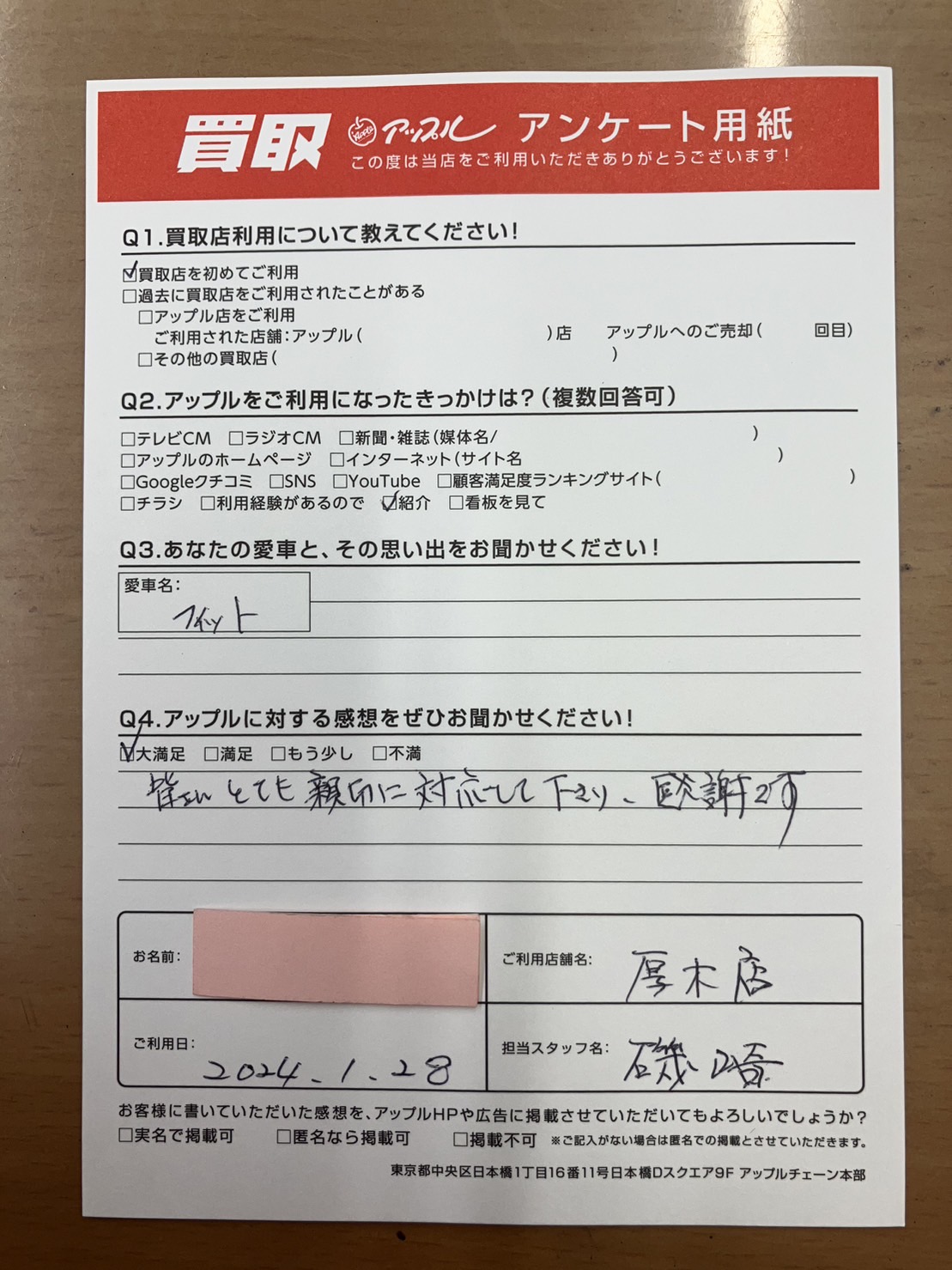 お車のご相談・ 査定だけでもOK! カンタン 入力 30秒 アップルがブランド買取始めました! お電話でも受付中! 受付時間10:00 ~ 19:00 046-246-2828 お車のご相談・ 査定だけでもOK! カンタン 入力 30秒 アップルがブランド買取始めました! お電話でも受付中! 受付時間10:00 ~ 19:00 046-246-2828 アップルがブランド買取始めました! お電話でも受付中! 受付時間10:00 ~ 19:00 046-246-2828 店舗情報 在庫車 スタッフ紹介 ブログ お客様の声 キャンペーン 無料査定 click お客様の声 ご記入日: 2024/01/28 神奈川県厚木市 H様 車名:ホンダ フィットハイブリッド(~H25年9月) 皆さんとても親切に対応して下さり感謝です。 前へ 次へ お客様の声一覧を見る