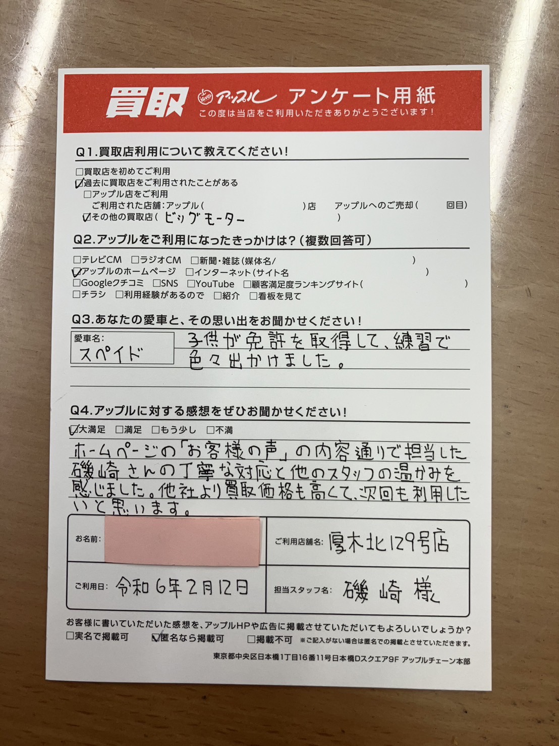 お車のご相談・ 査定だけでもOK! カンタン 入力 30秒 アップルがブランド買取始めました! お電話でも受付中! 受付時間10:00 ~ 19:00 046-246-2828 お車のご相談・ 査定だけでもOK! カンタン 入力 30秒 アップルがブランド買取始めました! お電話でも受付中! 受付時間10:00 ~ 19:00 046-246-2828 アップルがブランド買取始めました! お電話でも受付中! 受付時間10:00 ~ 19:00 046-246-2828 店舗情報 在庫車 スタッフ紹介 ブログ お客様の声 キャンペーン 無料査定 click お客様の声 ご記入日: 2024/02/12 神奈川県座間市 H様 車名:トヨタ スペイド ホームページの「お客様の声」の内容通りで担当した磯崎さんの丁寧な対応と他のスタッフの温かみを感じました。他社より買取価格も高くて、次回も利用したいと思います。 前へ 次へ お客様の声一覧を見る
