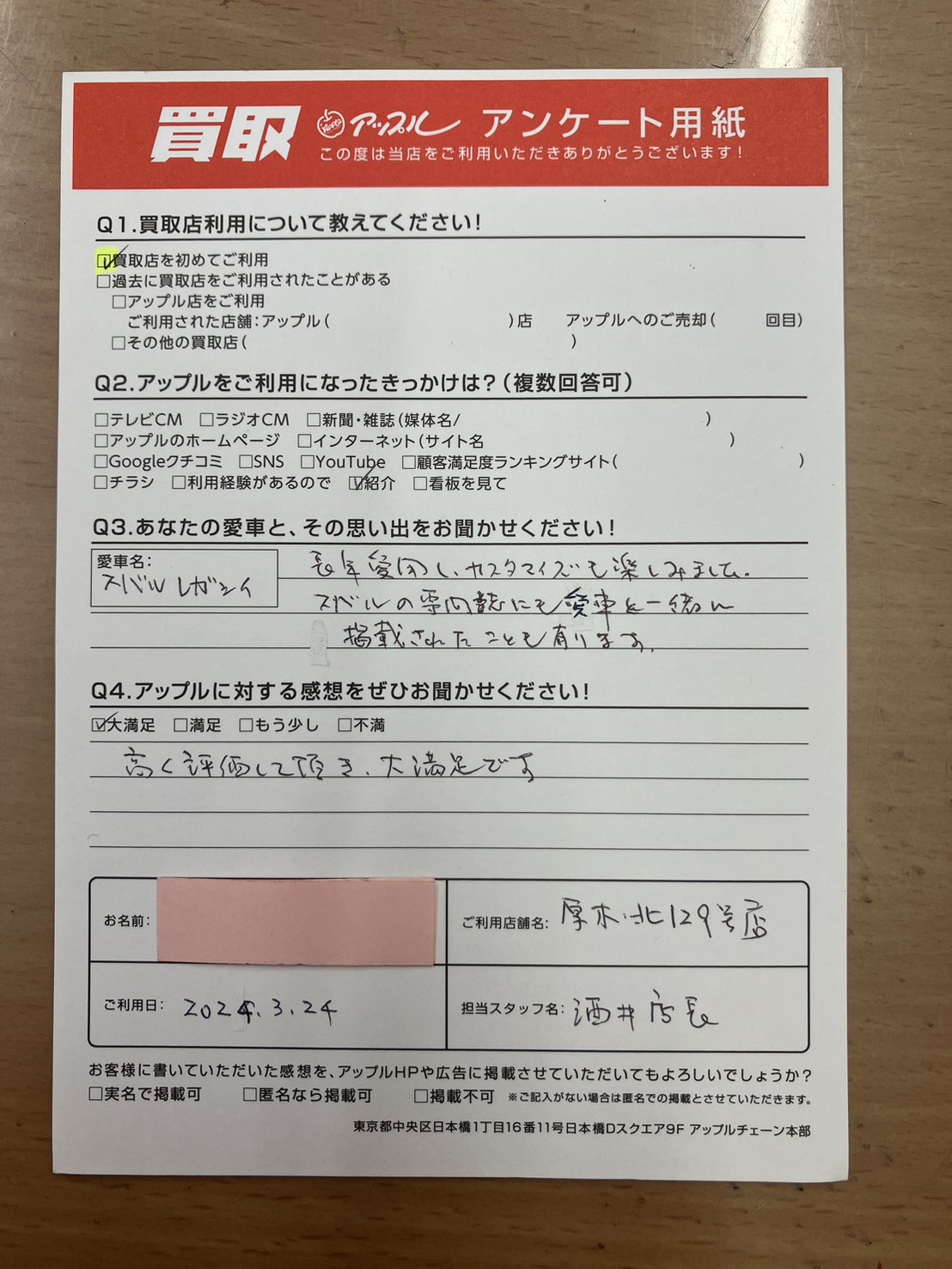 お車のご相談・ 査定だけでもOK! カンタン 入力 30秒 アップルがブランド買取始めました! お電話でも受付中! 受付時間10:00 ~ 19:00 046-246-2828 お車のご相談・ 査定だけでもOK! カンタン 入力 30秒 アップルがブランド買取始めました! お電話でも受付中! 受付時間10:00 ~ 19:00 046-246-2828 アップルがブランド買取始めました! お電話でも受付中! 受付時間10:00 ~ 19:00 046-246-2828 店舗情報 在庫車 スタッフ紹介 ブログ お客様の声 キャンペーン 無料査定 click お客様の声 ご記入日: 2024/03/24 海老名市 K様 車名:スバル レガシィツーリングワゴン 高く評価して頂き、大満足です。 前へ 次へ お客様の声一覧を見る
