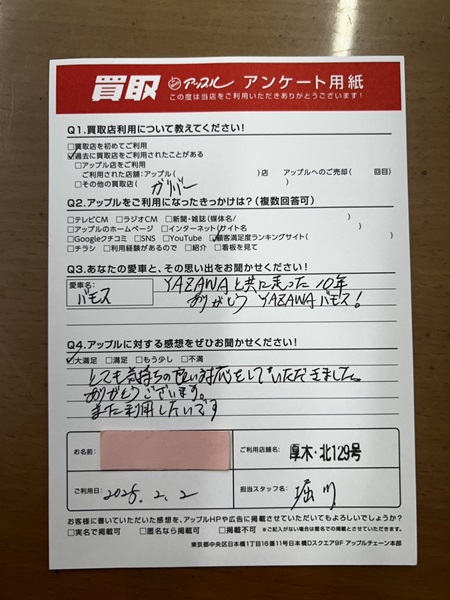 お車のご相談・ 査定だけでもOK! カンタン 入力 30秒 アップルがブランド買取始めました! お電話でも受付中! 受付時間10:00 ~ 19:00 046-246-2828 お車のご相談・ 査定だけでもOK! カンタン 入力 30秒 アップルがブランド買取始めました! お電話でも受付中! 受付時間10:00 ~ 19:00 046-246-2828 アップルがブランド買取始めました! お電話でも受付中! 受付時間10:00 ~ 19:00 046-246-2828 店舗情報 在庫車 スタッフ紹介 ブログ お客様の声 キャンペーン 無料査定 click お客様の声 ご記入日: 2025/02/02 座間市 M様 車名:ホンダ バモス YAZAWAと共に走った10年ありがとうYAZAWAバモス! 前へ 次へ お客様の声一覧を見る