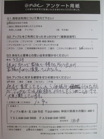 お車のご相談・ 査定だけでもOK! カンタン 入力 30秒 アップルがブランド買取始めました! お電話でも受付中! 受付時間10:00 ~ 19:00 046-246-2828 お車のご相談・ 査定だけでもOK! カンタン 入力 30秒 アップルがブランド買取始めました! お電話でも受付中! 受付時間10:00 ~ 19:00 046-246-2828 アップルがブランド買取始めました! お電話でも受付中! 受付時間10:00 ~ 19:00 046-246-2828 店舗情報 在庫車 スタッフ紹介 ブログ お客様の声 キャンペーン 無料査定 click お客様の声 ご記入日: 2017/01/09 A様 他社で査定してもらったら価格が付かなかったがアップルでは価格をつけてもらうことができ大変満足しています。 前へ 次へ お客様の声一覧を見る