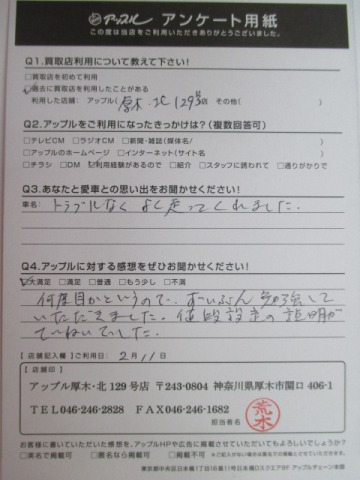 お車のご相談・ 査定だけでもOK! カンタン 入力 30秒 アップルがブランド買取始めました! お電話でも受付中! 受付時間10:00 ~ 19:00 046-246-2828 お車のご相談・ 査定だけでもOK! カンタン 入力 30秒 アップルがブランド買取始めました! お電話でも受付中! 受付時間10:00 ~ 19:00 046-246-2828 アップルがブランド買取始めました! お電話でも受付中! 受付時間10:00 ~ 19:00 046-246-2828 店舗情報 在庫車 スタッフ紹介 ブログ お客様の声 キャンペーン 無料査定 click お客様の声 ご記入日: 2017/02/11 A様 何度目かと言うのでずいぶん勉強していただきました。値段設定の説明がていねいでした。 前へ 次へ お客様の声一覧を見る