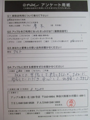 お車のご相談・ 査定だけでもOK! カンタン 入力 30秒 アップルがブランド買取始めました! お電話でも受付中! 受付時間10:00 ~ 19:00 046-246-2828 お車のご相談・ 査定だけでもOK! カンタン 入力 30秒 アップルがブランド買取始めました! お電話でも受付中! 受付時間10:00 ~ 19:00 046-246-2828 アップルがブランド買取始めました! お電話でも受付中! 受付時間10:00 ~ 19:00 046-246-2828 店舗情報 在庫車 スタッフ紹介 ブログ お客様の声 キャンペーン 無料査定 click お客様の声 ご記入日: 2017/03/20 H様 初めてで緊張して来店しましたが丁寧に対応していただき安心してお願いできました。 前へ 次へ お客様の声一覧を見る