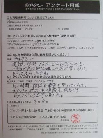 お車のご相談・ 査定だけでもOK! カンタン 入力 30秒 アップルがブランド買取始めました! お電話でも受付中! 受付時間10:00 ~ 19:00 046-246-2828 お車のご相談・ 査定だけでもOK! カンタン 入力 30秒 アップルがブランド買取始めました! お電話でも受付中! 受付時間10:00 ~ 19:00 046-246-2828 アップルがブランド買取始めました! お電話でも受付中! 受付時間10:00 ~ 19:00 046-246-2828 店舗情報 在庫車 スタッフ紹介 ブログ お客様の声 キャンペーン 無料査定 click お客様の声 ご記入日: 2017/03/09 F様 長い時間、相談や要望を聞いてくれてスタッフの対応も値段も満足です。ありがとうございました。 前へ 次へ お客様の声一覧を見る