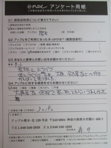 お車のご相談・ 査定だけでもOK! カンタン 入力 30秒 アップルがブランド買取始めました! お電話でも受付中! 受付時間10:00 ~ 19:00 046-246-2828 お車のご相談・ 査定だけでもOK! カンタン 入力 30秒 アップルがブランド買取始めました! お電話でも受付中! 受付時間10:00 ~ 19:00 046-246-2828 アップルがブランド買取始めました! お電話でも受付中! 受付時間10:00 ~ 19:00 046-246-2828 店舗情報 在庫車 スタッフ紹介 ブログ お客様の声 キャンペーン 無料査定 click お客様の声 ご記入日: 2017/03/19 O様 大満足な価格で買い取ってもらいうれしかった。 前へ 次へ お客様の声一覧を見る