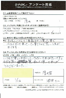 お車のご相談・ 査定だけでもOK! カンタン 入力 30秒 アップルがブランド買取始めました! お電話でも受付中! 受付時間10:00 ~ 19:00 046-246-2828 お車のご相談・ 査定だけでもOK! カンタン 入力 30秒 アップルがブランド買取始めました! お電話でも受付中! 受付時間10:00 ~ 19:00 046-246-2828 アップルがブランド買取始めました! お電話でも受付中! 受付時間10:00 ~ 19:00 046-246-2828 店舗情報 在庫車 スタッフ紹介 ブログ お客様の声 キャンペーン 無料査定 click お客様の声 ご記入日: 2018/01/12 S様 いつも丁寧に対応していただいてありがたいです。今回も高く買い取って頂いてありがとうございました!! 前へ 次へ お客様の声一覧を見る