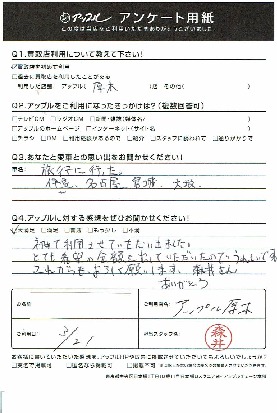 お車のご相談・ 査定だけでもOK! カンタン 入力 30秒 アップルがブランド買取始めました! お電話でも受付中! 受付時間10:00 ~ 19:00 046-246-2828 お車のご相談・ 査定だけでもOK! カンタン 入力 30秒 アップルがブランド買取始めました! お電話でも受付中! 受付時間10:00 ~ 19:00 046-246-2828 アップルがブランド買取始めました! お電話でも受付中! 受付時間10:00 ~ 19:00 046-246-2828 店舗情報 在庫車 スタッフ紹介 ブログ お客様の声 キャンペーン 無料査定 click お客様の声 ご記入日: 2018/03/21 S様 初めて利用させていただきました。とても希望の金額を出していただいたのでうれしいです。これからもよろしくお願いします。森井さん、ありがとう 前へ 次へ お客様の声一覧を見る