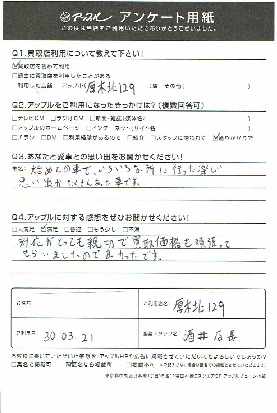 お車のご相談・ 査定だけでもOK! カンタン 入力 30秒 アップルがブランド買取始めました! お電話でも受付中! 受付時間10:00 ~ 19:00 046-246-2828 お車のご相談・ 査定だけでもOK! カンタン 入力 30秒 アップルがブランド買取始めました! お電話でも受付中! 受付時間10:00 ~ 19:00 046-246-2828 アップルがブランド買取始めました! お電話でも受付中! 受付時間10:00 ~ 19:00 046-246-2828 店舗情報 在庫車 スタッフ紹介 ブログ お客様の声 キャンペーン 無料査定 click お客様の声 ご記入日: 2018/03/21 S様 対応がとっても親切で買取価格も頑張ってもらいましたので良かったです。 前へ 次へ お客様の声一覧を見る