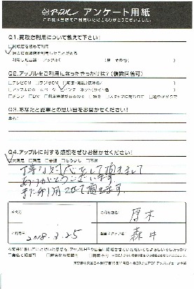 お車のご相談・ 査定だけでもOK! カンタン 入力 30秒 アップルがブランド買取始めました! お電話でも受付中! 受付時間10:00 ~ 19:00 046-246-2828 お車のご相談・ 査定だけでもOK! カンタン 入力 30秒 アップルがブランド買取始めました! お電話でも受付中! 受付時間10:00 ~ 19:00 046-246-2828 アップルがブランド買取始めました! お電話でも受付中! 受付時間10:00 ~ 19:00 046-246-2828 店舗情報 在庫車 スタッフ紹介 ブログ お客様の声 キャンペーン 無料査定 click お客様の声 ご記入日: 2018/03/25 N様 丁寧な対応をして頂きましてありがとうございます。また利用させて頂きます。 前へ 次へ お客様の声一覧を見る