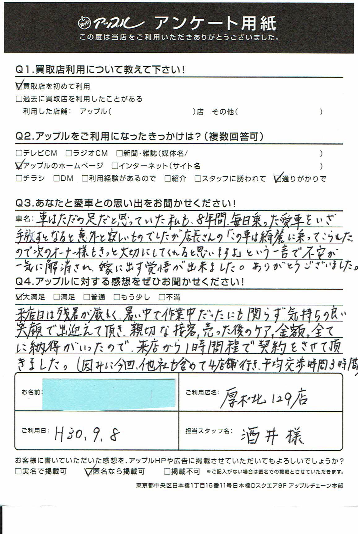 来店日は残暑が厳しく、暑い中で作業中だったにも関わらず気持ちの良い笑顔で出迎えて頂き、親切な接客、売った後のケア、金額、全てに納得がいったので、来店から1時間程で契約をさせて頂きました。(因みに今回、他社も含めて4店舗行き、平均交渉時間3時間)