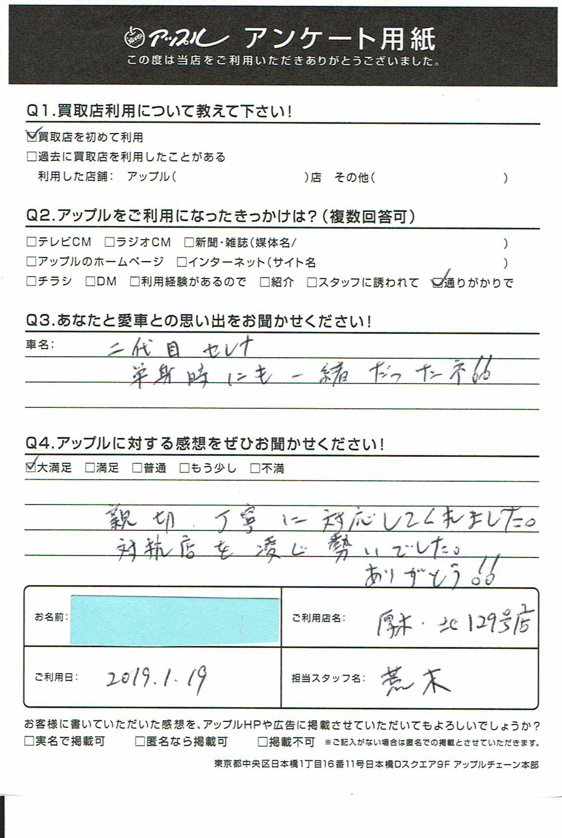 お車のご相談・ 査定だけでもOK! カンタン 入力 30秒 アップルがブランド買取始めました! お電話でも受付中! 受付時間10:00 ~ 19:00 046-246-2828 お車のご相談・ 査定だけでもOK! カンタン 入力 30秒 アップルがブランド買取始めました! お電話でも受付中! 受付時間10:00 ~ 19:00 046-246-2828 アップルがブランド買取始めました! お電話でも受付中! 受付時間10:00 ~ 19:00 046-246-2828 店舗情報 在庫車 スタッフ紹介 ブログ お客様の声 キャンペーン 無料査定 click お客様の声 ご記入日: 2019/01/19 A様 車名:日産 セレナ 親切、丁寧に対応してくれました。対抗店を凌ぐ勢いでした。ありがとう!! 前へ 次へ お客様の声一覧を見る