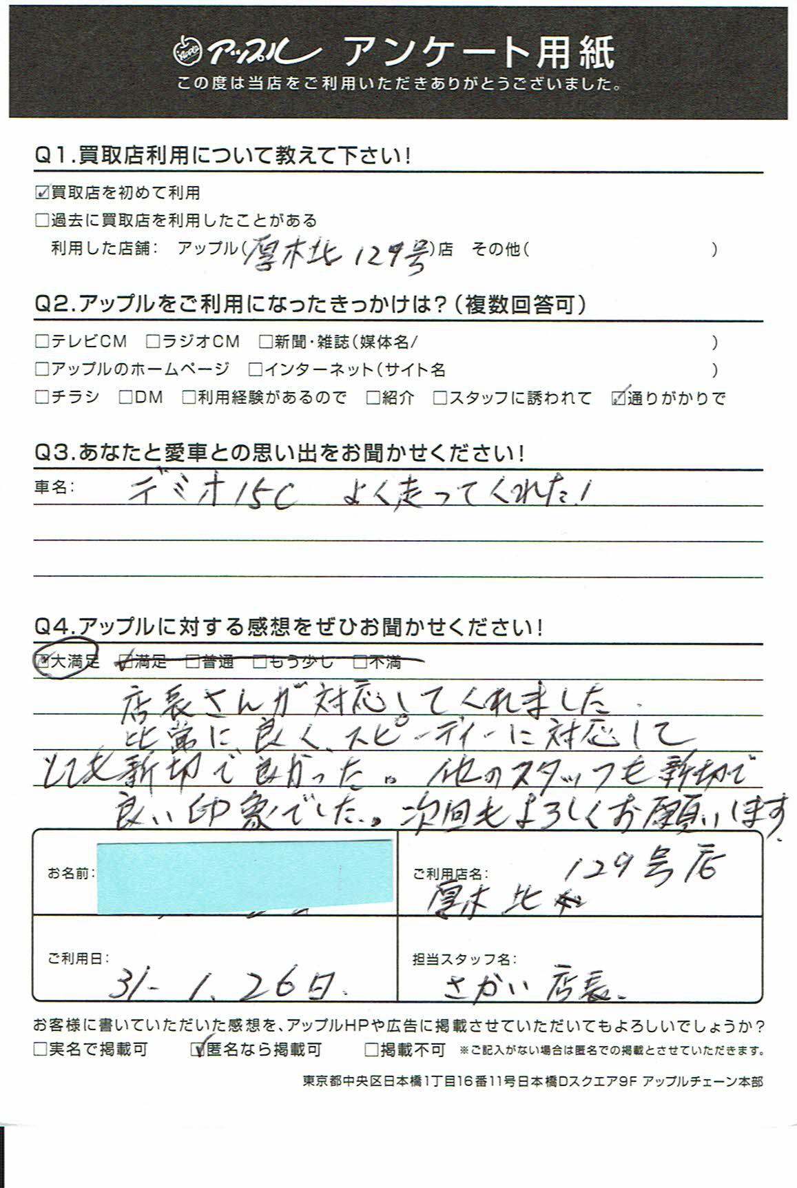 お車のご相談・ 査定だけでもOK! カンタン 入力 30秒 アップルがブランド買取始めました! お電話でも受付中! 受付時間10:00 ~ 19:00 046-246-2828 お車のご相談・ 査定だけでもOK! カンタン 入力 30秒 アップルがブランド買取始めました! お電話でも受付中! 受付時間10:00 ~ 19:00 046-246-2828 アップルがブランド買取始めました! お電話でも受付中! 受付時間10:00 ~ 19:00 046-246-2828 店舗情報 在庫車 スタッフ紹介 ブログ お客様の声 キャンペーン 無料査定 click お客様の声 ご記入日: 2019/01/26 K様 車名:マツダ デミオ 店長さんが対応してくれました。非常に良く、スピーディーに対応してとても親切で良かった。他のスタッフも親切で良い印象でした。次回もよろしくお願いします。 前へ 次へ お客様の声一覧を見る
