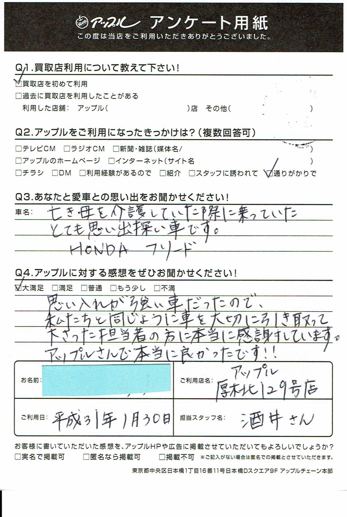 お車のご相談・ 査定だけでもOK! カンタン 入力 30秒 アップルがブランド買取始めました! お電話でも受付中! 受付時間10:00 ~ 19:00 046-246-2828 お車のご相談・ 査定だけでもOK! カンタン 入力 30秒 アップルがブランド買取始めました! お電話でも受付中! 受付時間10:00 ~ 19:00 046-246-2828 アップルがブランド買取始めました! お電話でも受付中! 受付時間10:00 ~ 19:00 046-246-2828 店舗情報 在庫車 スタッフ紹介 ブログ お客様の声 キャンペーン 無料査定 click お客様の声 ご記入日: 2019/01/30 I様 車名:ホンダ フリード(H28年9月以降のハイブリッド含む) 思い入れが強い車だったので、私たちと同じように車を大切に引き取って下さった担当者の方に本当に感謝しています。アップルさんで本当に良かったです!! 前へ 次へ お客様の声一覧を見る
