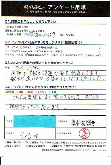 お車のご相談・ 査定だけでもOK! カンタン 入力 30秒 アップルがブランド買取始めました! お電話でも受付中! 受付時間10:00 ~ 19:00 046-246-2828 お車のご相談・ 査定だけでもOK! カンタン 入力 30秒 アップルがブランド買取始めました! お電話でも受付中! 受付時間10:00 ~ 19:00 046-246-2828 アップルがブランド買取始めました! お電話でも受付中! 受付時間10:00 ~ 19:00 046-246-2828 店舗情報 在庫車 スタッフ紹介 ブログ お客様の声 キャンペーン 無料査定 click お客様の声 ご記入日: 2019/02/24 S様 車名:ダイハツ タントエグゼ こちらの要望をよく聞いてくれて、対応も親切だったと思います。 前へ 次へ お客様の声一覧を見る
