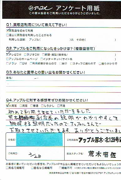 お車のご相談・ 査定だけでもOK! カンタン 入力 30秒 アップルがブランド買取始めました! お電話でも受付中! 受付時間10:00 ~ 19:00 046-246-2828 お車のご相談・ 査定だけでもOK! カンタン 入力 30秒 アップルがブランド買取始めました! お電話でも受付中! 受付時間10:00 ~ 19:00 046-246-2828 アップルがブランド買取始めました! お電話でも受付中! 受付時間10:00 ~ 19:00 046-246-2828 店舗情報 在庫車 スタッフ紹介 ブログ お客様の声 キャンペーン 無料査定 click お客様の声 ご記入日: 2019/02/28 N様 車名:スズキ ワゴンR はじめて利用させて頂きました。荒木副店長の説明が分かりやすくて納得する説明だったのでアップルさんで下取りをさせていただきます。ありがとうございました。 前へ 次へ お客様の声一覧を見る