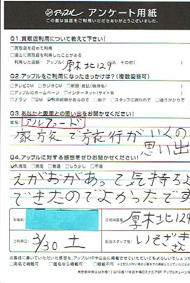 お車のご相談・ 査定だけでもOK! カンタン 入力 30秒 アップルがブランド買取始めました! お電話でも受付中! 受付時間10:00 ~ 19:00 046-246-2828 お車のご相談・ 査定だけでもOK! カンタン 入力 30秒 アップルがブランド買取始めました! お電話でも受付中! 受付時間10:00 ~ 19:00 046-246-2828 アップルがブランド買取始めました! お電話でも受付中! 受付時間10:00 ~ 19:00 046-246-2828 店舗情報 在庫車 スタッフ紹介 ブログ お客様の声 キャンペーン 無料査定 click お客様の声 ご記入日: 2019/03/30 K様 車名:トヨタ アルファード(H27年1月~のHYBRID含む) えがおがあって気持ちよくできたのでよかったです。(お客様のお子様に暖かいお言葉を頂きました) 前へ 次へ お客様の声一覧を見る