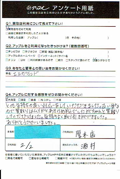 お車のご相談・ 査定だけでもOK! カンタン 入力 30秒 アップルがブランド買取始めました! お電話でも受付中! 受付時間10:00 ~ 19:00 046-246-2828 お車のご相談・ 査定だけでもOK! カンタン 入力 30秒 アップルがブランド買取始めました! お電話でも受付中! 受付時間10:00 ~ 19:00 046-246-2828 アップルがブランド買取始めました! お電話でも受付中! 受付時間10:00 ~ 19:00 046-246-2828 店舗情報 在庫車 スタッフ紹介 ブログ お客様の声 キャンペーン 無料査定 click お客様の声 ご記入日: 2019/02/02 K様 車名:日産 エルグランド とても気持ちの良い対応をして頂きました。古い車なので買取りはムリかと諦め半分でしたがちゃんと買取りして頂けました。気持ちよく取引が出来ました。ありがとうございました。 前へ 次へ お客様の声一覧を見る