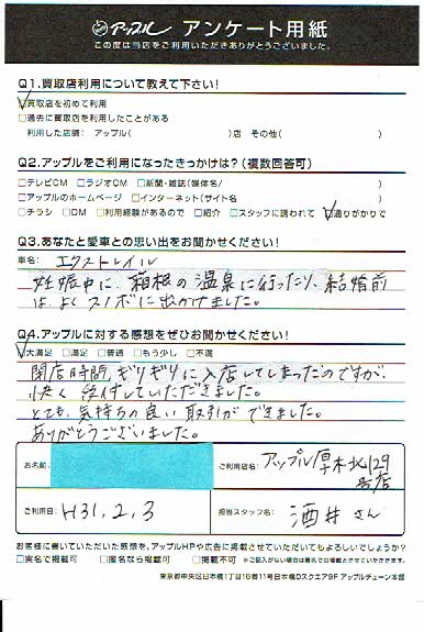 お車のご相談・ 査定だけでもOK! カンタン 入力 30秒 アップルがブランド買取始めました! お電話でも受付中! 受付時間10:00 ~ 19:00 046-246-2828 お車のご相談・ 査定だけでもOK! カンタン 入力 30秒 アップルがブランド買取始めました! お電話でも受付中! 受付時間10:00 ~ 19:00 046-246-2828 アップルがブランド買取始めました! お電話でも受付中! 受付時間10:00 ~ 19:00 046-246-2828 店舗情報 在庫車 スタッフ紹介 ブログ お客様の声 キャンペーン 無料査定 click お客様の声 ご記入日: 2019/02/03 I様 車名:日産 エクストレイル 閉店時間ギリギリに入店してしまったのですが、快く受付していただきました。とても気持ちのいい取引ができました。ありがとうございました。 前へ 次へ お客様の声一覧を見る