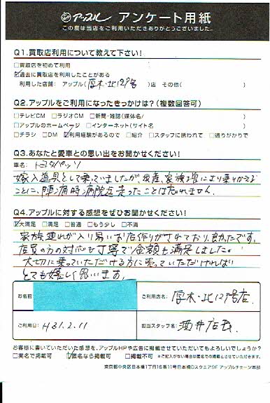 お車のご相談・ 査定だけでもOK! カンタン 入力 30秒 アップルがブランド買取始めました! お電話でも受付中! 受付時間10:00 ~ 19:00 046-246-2828 お車のご相談・ 査定だけでもOK! カンタン 入力 30秒 アップルがブランド買取始めました! お電話でも受付中! 受付時間10:00 ~ 19:00 046-246-2828 アップルがブランド買取始めました! お電話でも受付中! 受付時間10:00 ~ 19:00 046-246-2828 店舗情報 在庫車 スタッフ紹介 ブログ お客様の声 キャンペーン 無料査定 click お客様の声 ご記入日: 2019/02/11 O様 車名:トヨタ パッソ 家族連れが入りやすいお店作りがされており良かったです。店員の方の対応も丁寧で金額も満足しました。大切に乗って頂ける方に売って頂ければとても嬉しく思います。 前へ 次へ お客様の声一覧を見る