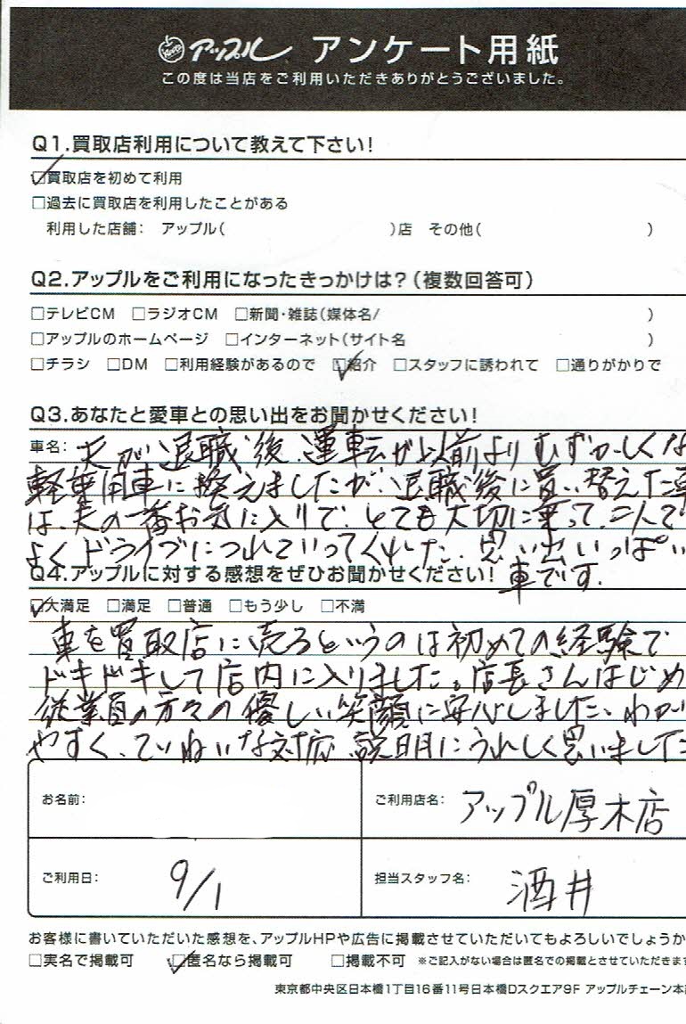 お車のご相談・ 査定だけでもOK! カンタン 入力 30秒 アップルがブランド買取始めました! お電話でも受付中! 受付時間10:00 ~ 19:00 046-246-2828 お車のご相談・ 査定だけでもOK! カンタン 入力 30秒 アップルがブランド買取始めました! お電話でも受付中! 受付時間10:00 ~ 19:00 046-246-2828 アップルがブランド買取始めました! お電話でも受付中! 受付時間10:00 ~ 19:00 046-246-2828 店舗情報 在庫車 スタッフ紹介 ブログ お客様の声 キャンペーン 無料査定 click お客様の声 ご記入日: 2020/09/01 厚木市 K様 車名:スズキ ワゴンR 車を買取店に売るというのは初めての経験でドキドキして店内に入りました。店長さんはじめ従業員の方々の優しい笑顔に安心しました。分かりやすく丁寧な対応、説明にうれしく思いました。 前へ 次へ お客様の声一覧を見る
