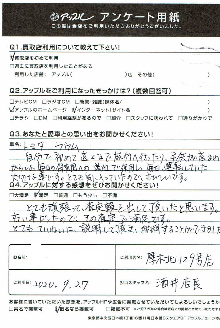 お車のご相談・ 査定だけでもOK! カンタン 入力 30秒 アップルがブランド買取始めました! お電話でも受付中! 受付時間10:00 ~ 19:00 046-246-2828 お車のご相談・ 査定だけでもOK! カンタン 入力 30秒 アップルがブランド買取始めました! お電話でも受付中! 受付時間10:00 ~ 19:00 046-246-2828 アップルがブランド買取始めました! お電話でも受付中! 受付時間10:00 ~ 19:00 046-246-2828 店舗情報 在庫車 スタッフ紹介 ブログ お客様の声 キャンペーン 無料査定 click お客様の声 ご記入日: 2020/09/27 厚木市 I様 車名:トヨタ ラウム とても頑張って査定額を出して頂いたと思います。古い車だったのでその査定で満足です。とても丁寧に説明して頂き納得することができました。 前へ 次へ お客様の声一覧を見る