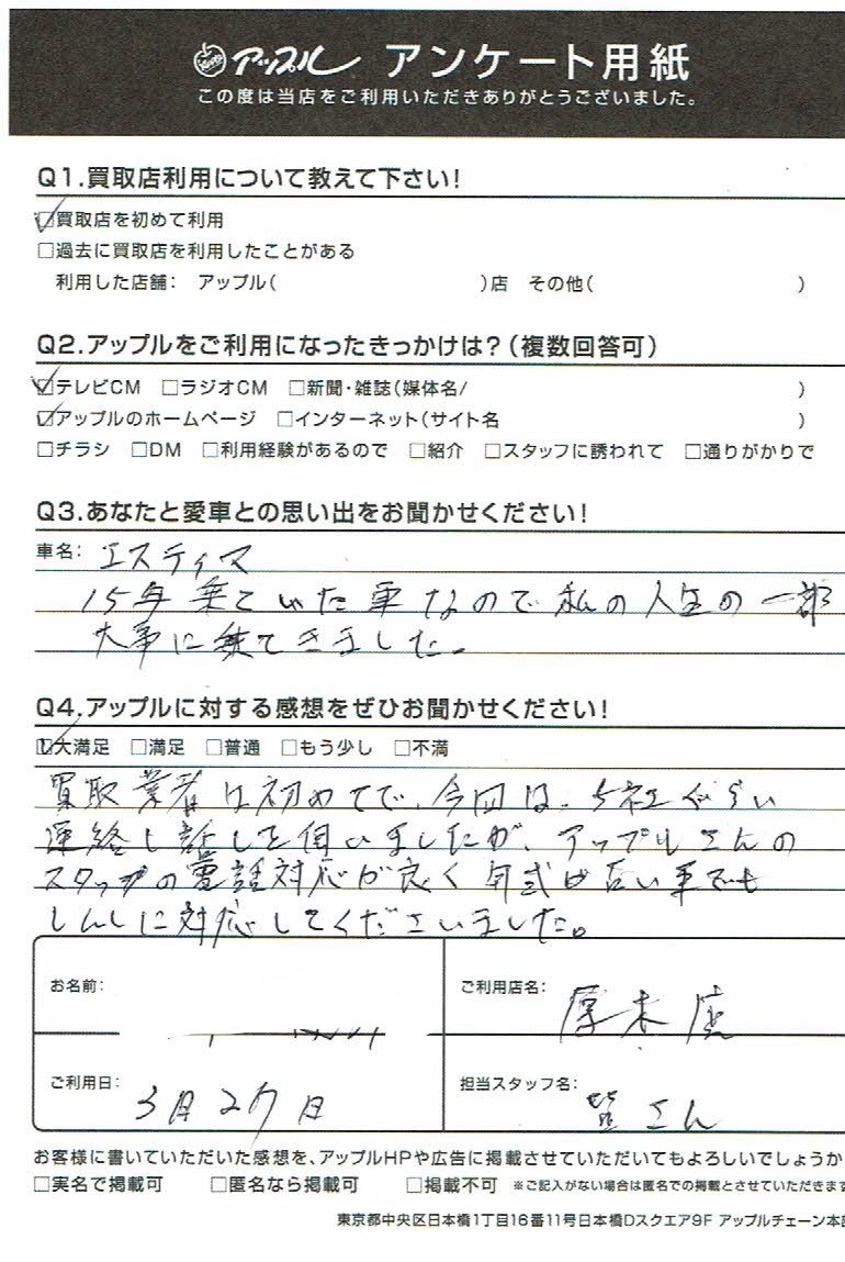 お車のご相談・ 査定だけでもOK! カンタン 入力 30秒 アップルがブランド買取始めました! お電話でも受付中! 受付時間10:00 ~ 19:00 046-246-2828 お車のご相談・ 査定だけでもOK! カンタン 入力 30秒 アップルがブランド買取始めました! お電話でも受付中! 受付時間10:00 ~ 19:00 046-246-2828 アップルがブランド買取始めました! お電話でも受付中! 受付時間10:00 ~ 19:00 046-246-2828 店舗情報 在庫車 スタッフ紹介 ブログ お客様の声 キャンペーン 無料査定 click お客様の声 ご記入日: 2020/03/27 厚木市 Y様 車名:トヨタ エスティマ 買取業者は初めてで今回は5社ぐらい連絡も話を伺いましたが、アップルさんのスタッフの電話対応が良く年式が古い車でも真摯に対応して下さいました。 前へ 次へ お客様の声一覧を見る