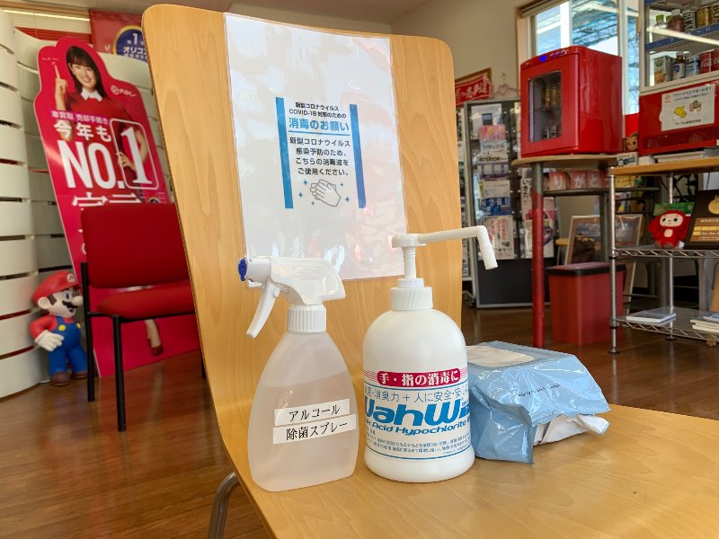 消毒液を設置させて頂いており、皆様に少しでも安心してご来店頂けるよう取り組ませて頂いております。