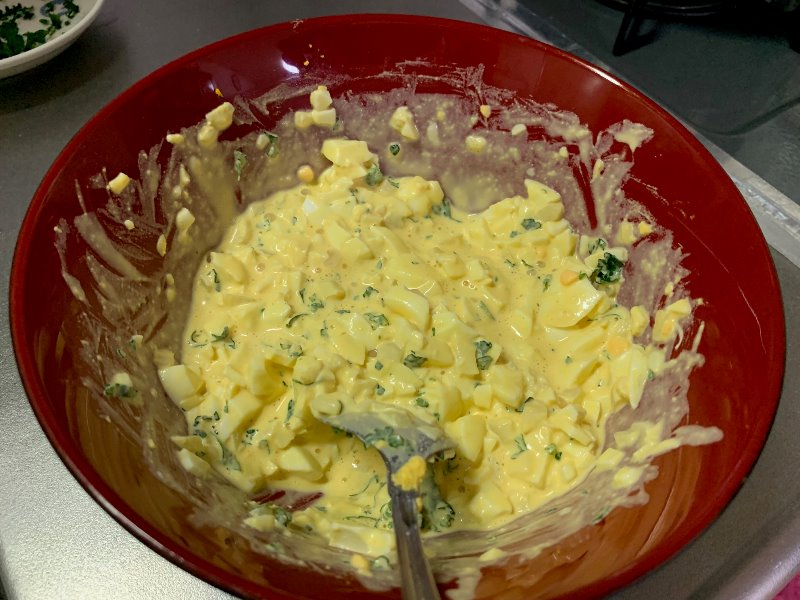 先程のゆで卵たちの入った容器にマヨネーズたちとパセリをを混ぜ合わせ・・・(だんだんそれっぽくなってきました)