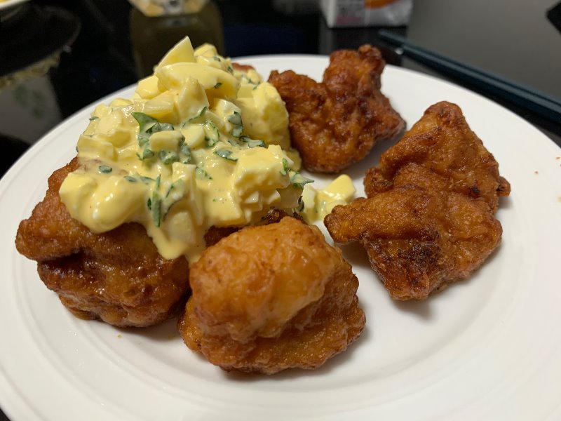 見た目は不思議なものですが、中身はよく食べるタルタルチキン南蛮でした(*^▽^*)
